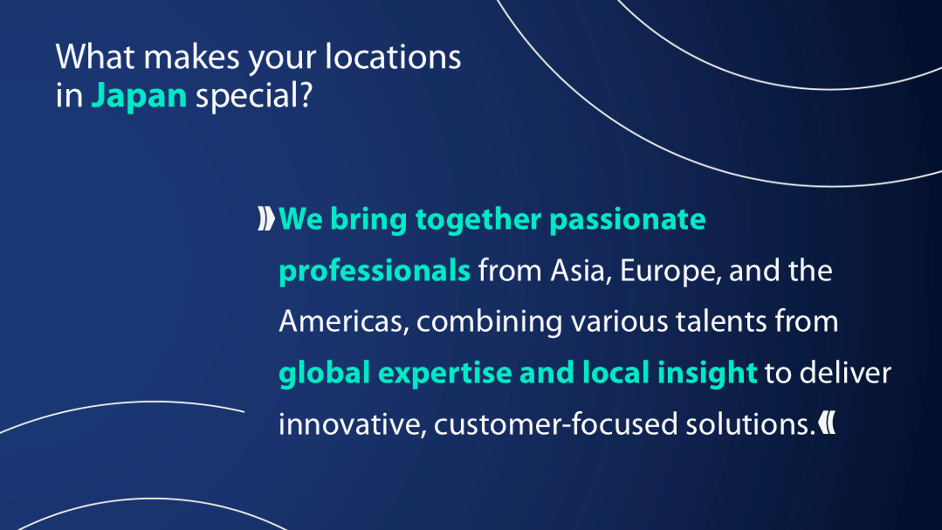 Unsere Teams in Japan arbeiten eng mit Kolleginnen und Kollegen aus China, Taiwan, der Mongolei, Südkorea, Indien, Südostasien, Europa und Amerika zusammen – über Kulturen und Grenzen hinweg. In beiden Geschäftsbereichen bieten sie erstklassige lokale Unterstützung und und erfüllen die Erwartungen unserer Kunden in hohem Maße.