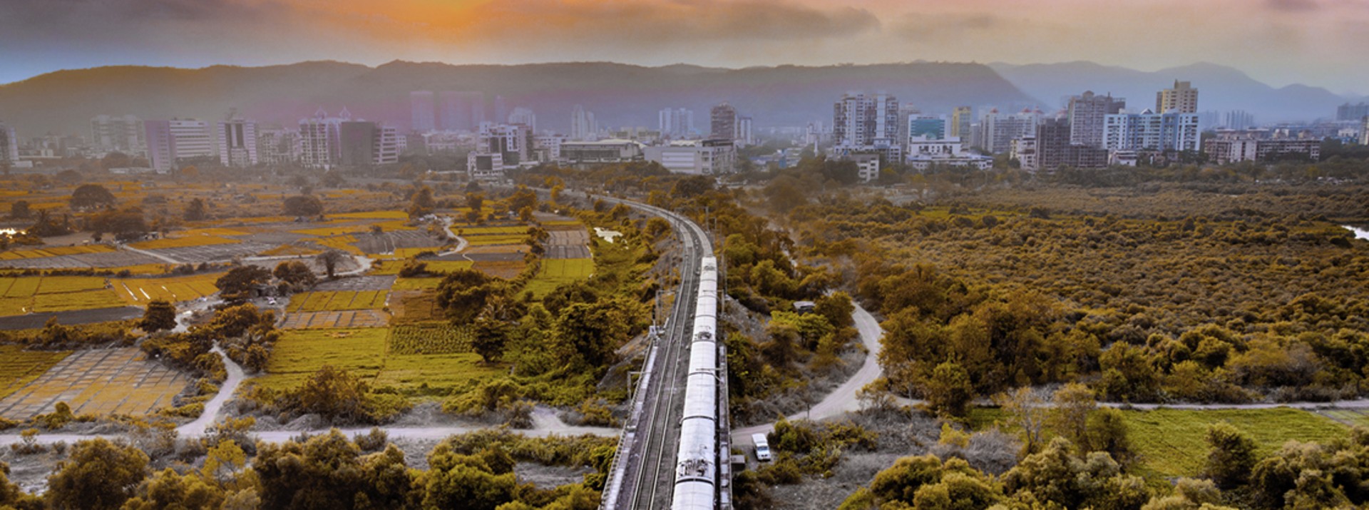 A train passing through the mangrove landscape outside Mumbai – a symbol of rail transport as the backbone of the region’s urban mobility.